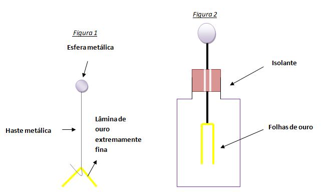 Com base na figura 1 podemos observar que o eletroscópio de folha é composto por uma haste metálica, que está presa a uma rolha de cortiça, já com base na figura 2 podemos observar que a rolha está dentro do recipiente de vidro.